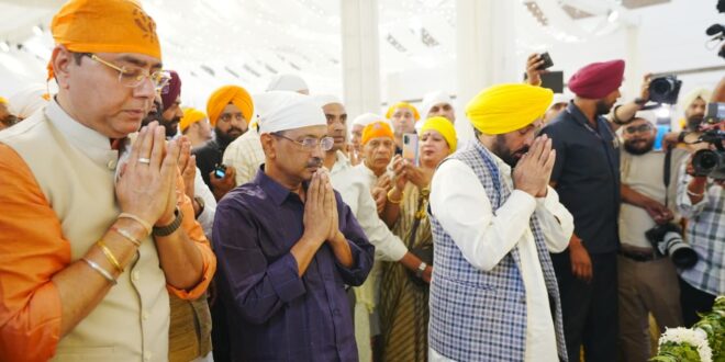 नई दिल्ली/चंडीगढ़, (PNL) : पंजाब के मुख्यमंत्री भगवंत सिंह मान और आम आदमी पार्टी के राष्ट्रीय संयोजक अरविंद केजरीवाल ने आज पंजाब सरकार द्वारा श्री गुरु तेग़ बहादर जी के 350वें शहादत दिवस के अवसर पर आयोजित कार्यक्रमों की श्रृंखला के हिस्से के रूप में आयोजित कीर्तन दरबार में भाग लिया और आध्यात्मिक कीर्तन का आनंद लिया।