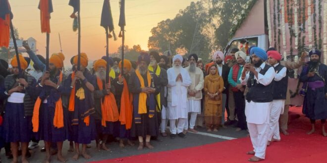 पठानकोट, (PNL) : नौंवे पातशाह श्री गुरु तेग़ बहादुर जी के 350वें शहीदी दिवस के संबंध में श्रीनगर से 19 नवंबर को शुरू हुए नगर कीर्तन का आज पंजाब में प्रवेश करते समय माधोपुर हैड पर कैबिनेट मंत्री लाल चंद कटारूचक्क, जिला प्रशासन पठानकोट तथा संगत द्वारा फूलों की वर्षा कर भव्य स्वागत किया गया। नगर कीर्तन के पंजाब में प्रवेश करने पर पंजाब पुलिस की टुकड़ी द्वारा सलामी दी गई। इस दौरान निहंग सिंहों ने गतके के जौहर भी दिखाये।