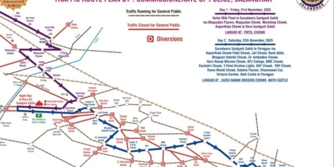 जालंधर, (PNL) : श्री गुरु तेग बहादुर साहिब जी के 350वें शहीदी दिवस को समर्पित जालंधर में आज पहुंचने वाले नगर कीर्तन का रूट प्लान जारी कर दिया गया है। नगर कीर्तन आज शाम 7 बजे शहर में प्रवेश करेगा।