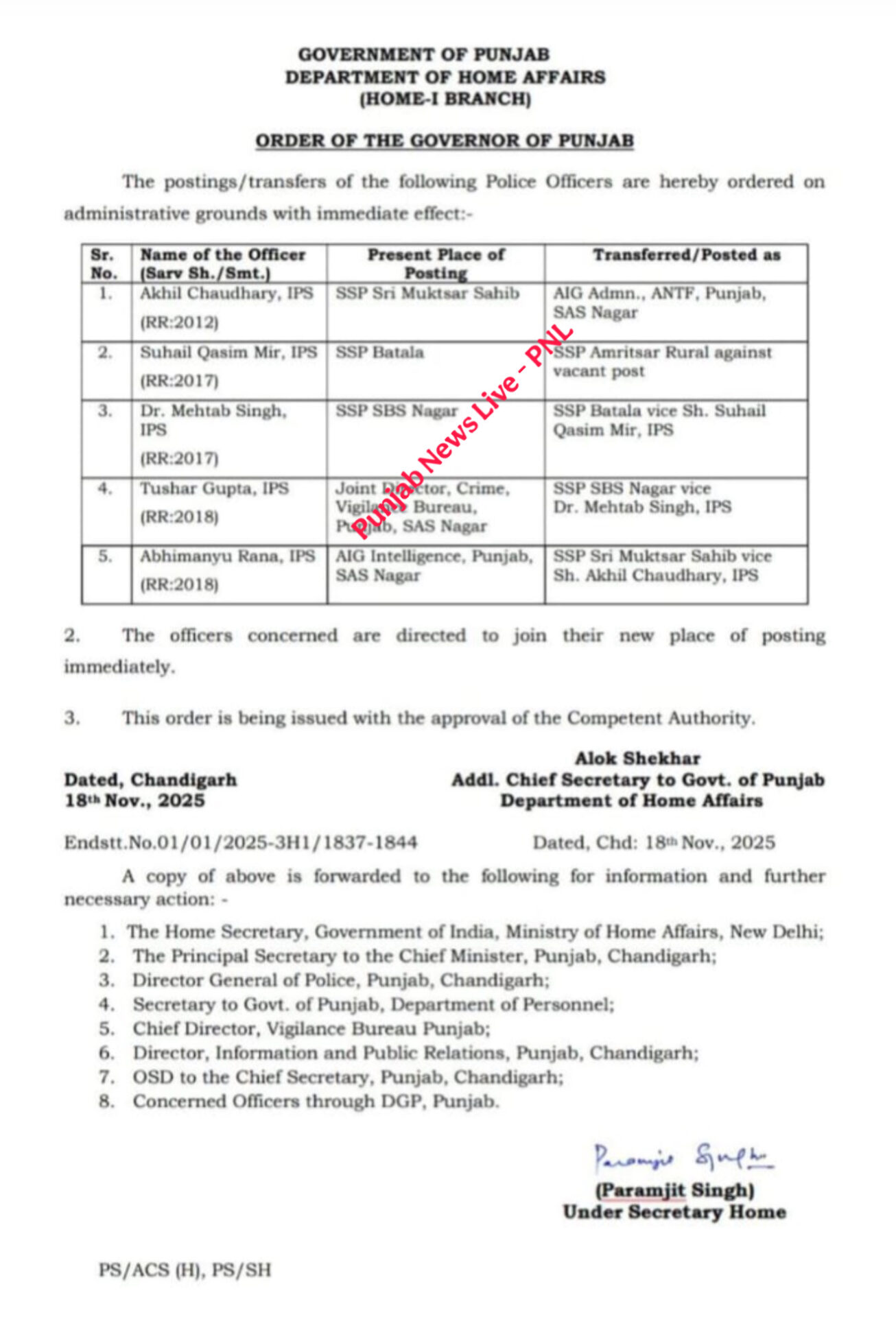 पंजाब में तीन जिलों के SSP समेत 5 IPS अधिकारियों का तबादला, देखें लिस्ट Punjab News Live -PNL November 18, 2025 चंडीगढ़, ताजा खबर, पंजाब, होम Leave a comment Related Articles अच्छी खबर : अब नए बिजली कनेक्शनों के लिए NOC की आवश्यकता नहीं, कैबिनेट मंत्री संजीव अरोड़ा ने किया ऐलान, पढ़ें November 18, 2025 बड़ी खबर : पंजाब के DGP गौरव यादव को चुनाव आयोग ने किया तलब, तरनतारन चुनाव से जुड़ा है मामला, पढ़ें November 18, 2025 नितिन कोहली की पहल से 18 साल बाद सूर्या एन्क्लेव व महाराजा रणजीत सिंह एवेन्यू का विकास शुरू, नगर निगम में ट्रांसफर को मिली मंजूरी November 18, 2025 Share Facebook Twitter Stumbleupon LinkedIn Pinterest