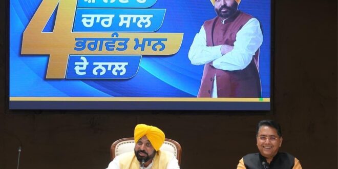 चंडीगढ़, (PNL) : आम आदमी पार्टी (आप) सरकार की ‘शानदार चार साल भगवंत मान दे नाल’ श्रृंखला के तहत पंजाब के मुख्यमंत्री भगवंत मान ने मुख्य क्षेत्रों में आप सरकार की कारगुजारी पर प्रकाश डालते हुये अपनी सरकार का रिपोर्ट कार्ड पेश करते हुए इसे पारदर्शी, जवाबदेह और जन-केंद्रित शासन की दिशा में एक महत्वपूर्ण बदलाव बताया।
