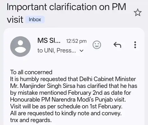 अब इस मामले में मनजिंदर सिरसा के ऑफिस से सूचना भेजी गई कि PM मोदी एक फरवरी को ही जालंधर आएंगे। दिल्ली के मंत्री मनजिंदर सिरसा ने पहले ही क्लियर कर दिया कि उन्होंने गलती से 2 फरवरी बता दिया, PM मोदी का दौरा एक फरवरी को ही फाइनल है।