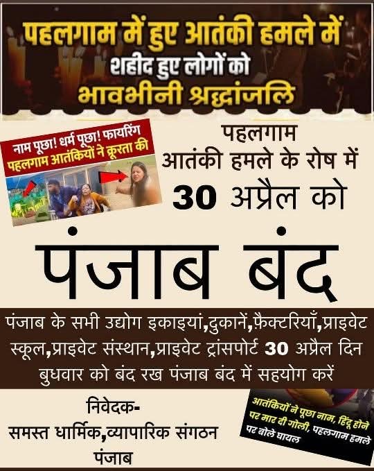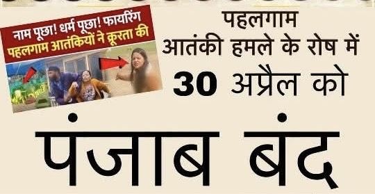 चंडीगढ़, (PNL) : पहलगाम में आतंकवादी हमले में मारे गए लोगों को श्रद्धांजलि देने के लिए 30 अप्रैल को पंजाब बंद के आह्वान को लेकर सोशल मीडिया पर एक पोस्टर वायरल हो रहा है। जिसमें सभी धार्मिक व व्यापारिक संगठनों के आह्वान पर 30 अप्रैल को पंजाब बंद का आह्वान किया गया है। इस कथित पोस्टर में पंजाब की सभी औद्योगिक इकाइयों, दुकानों, कारखानों, निजी स्कूलों, निजी संस्थानों, निजी ट्रांसपोर्टरों से बुधवार 30 अप्रैल को बंद में सहयोग करने की अपील की गई है।