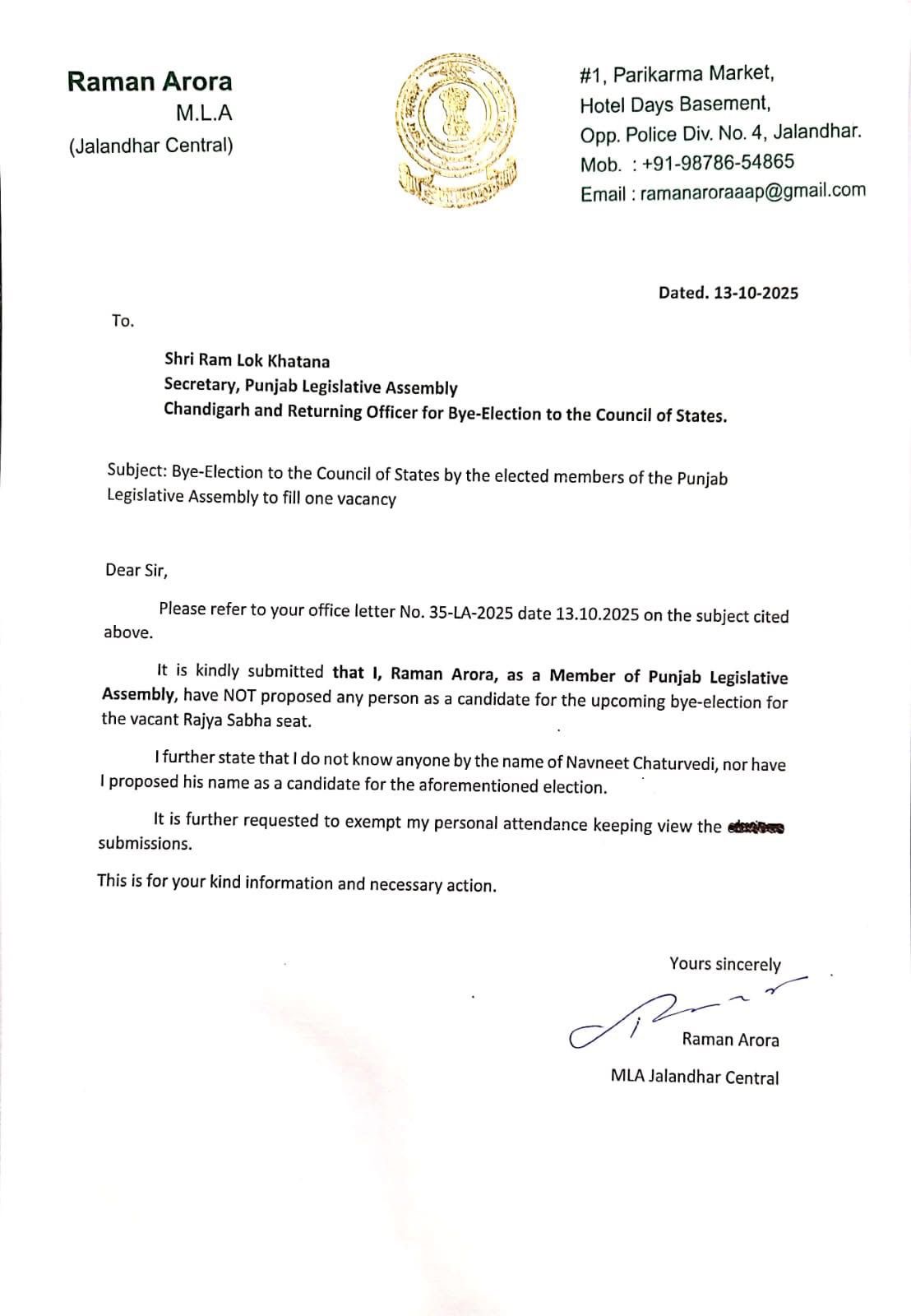 उसमें विधायक रमन अरोड़ा के भी हस्ताक्षर किए गए हैं। नवीन ने विधायक रमन अरोड़ा को पेशे से वकील बताया जबकि रमन विधायकी से पहले पेशे से कपड़ा दुकानदार थे। रमन ने खुद सोशल मीडिया पर विधानसभा के सचिव के नाम पर पत्र लिखा है। उसमें कहा गया है कि उन्होंने किसी भी नवीन नामक व्यक्ति को राज्यसभा सीट के लिए हक में साइन नहीं किए हैं।
