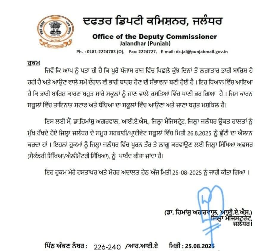 जालंधर में कल सरकारी और प्राइवेट स्कूलों में छुट्टी का ऐलान, डीसी ने जारी किए आदेश, पढ़ें Punjab News Live -PNL August 25, 2025 जालंधर, ताजा खबर, पंजाब, होम Leave a comment Related Articles नितिन कोहली का बड़ा तोहफ़ा : सूर्य एन्क्लेव और महाराजा रणजीत सिंह एवेन्यू जल्द नगर निगम को सौंपे जाएंगे October 8, 2025 बड़ी खबर : पंजाब पुलिस में DSP स्तर के 133 पुलिस अधिकारियों का तबादला, देखें लिस्ट October 8, 2025 जालंधर : स्व. हकीम तिलक राज कपूर के बेटे हरीश कपूर की रस्म किरया आज, पढ़ें October 8, 2025 Share Facebook Twitter Stumbleupon LinkedIn Pinterest